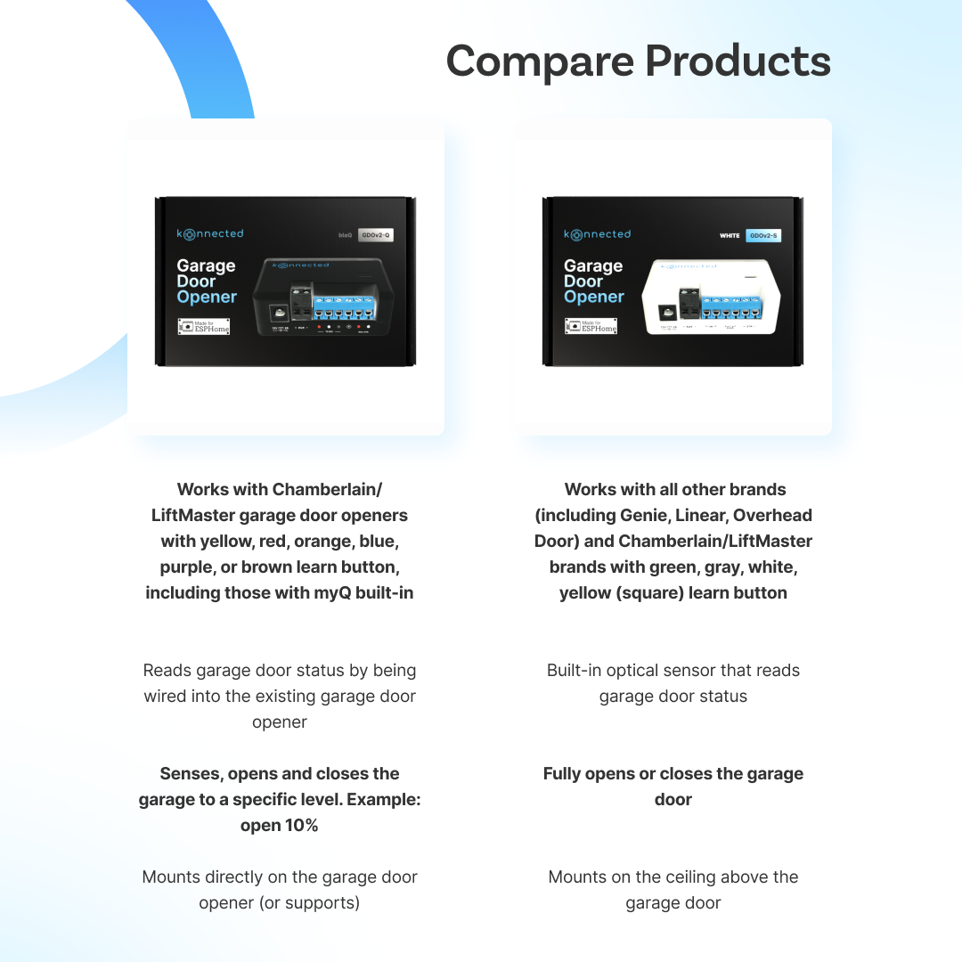 Konnected's GDO White works with garage door openers that are triggered to open or close by a simple push button or dry-contact closure. This includes most garage door openers except those with a yellow learn button. Read more.